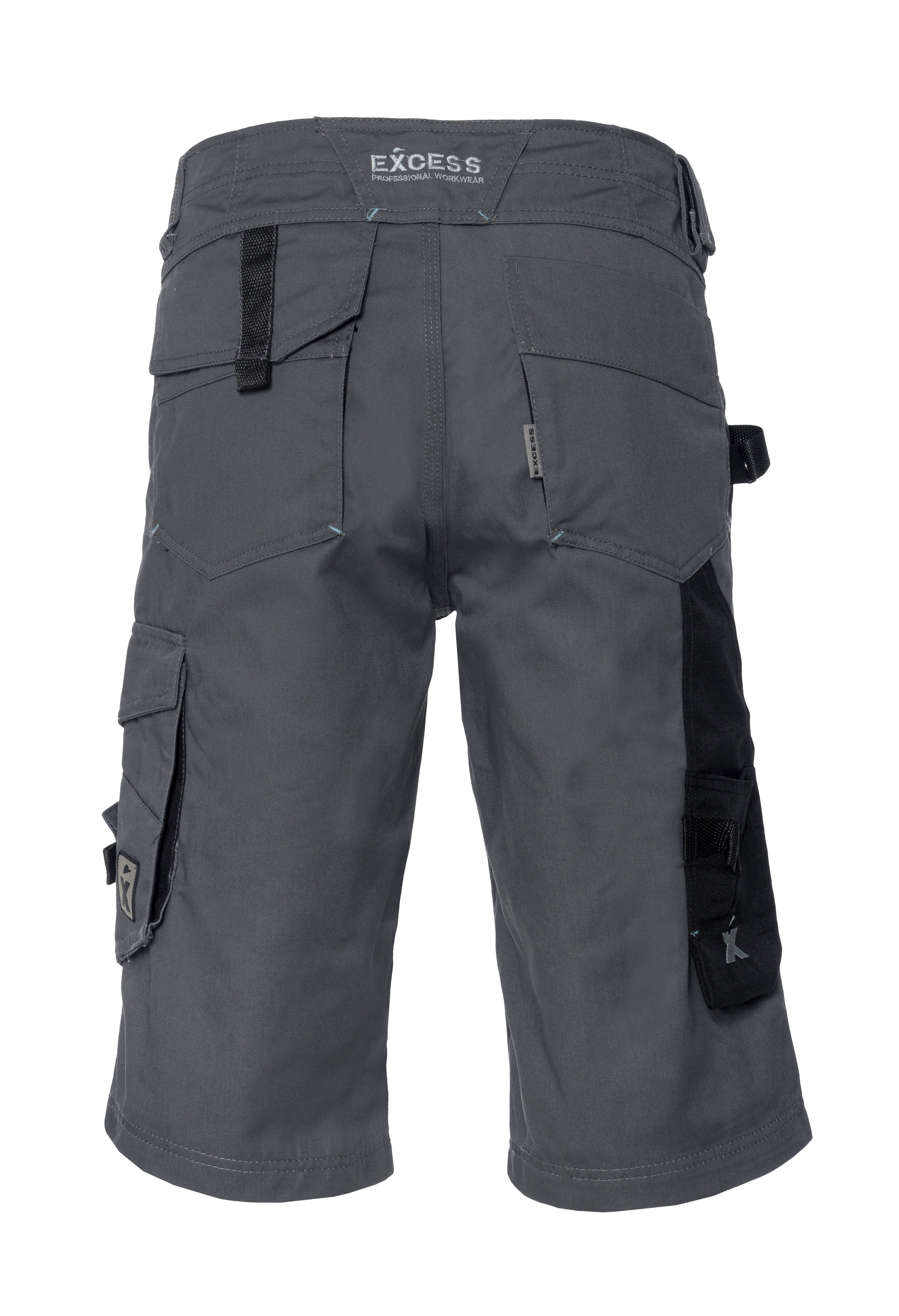 Schwarz-graue Arbeitshose von Excess Workwear mit funktionalen Taschen, Reflexdetails und verstärkten Knien. Robustes Material, ergonomischer Schnitt und zahlreiche Staumöglichkeiten für Werkzeug und Zubehör.